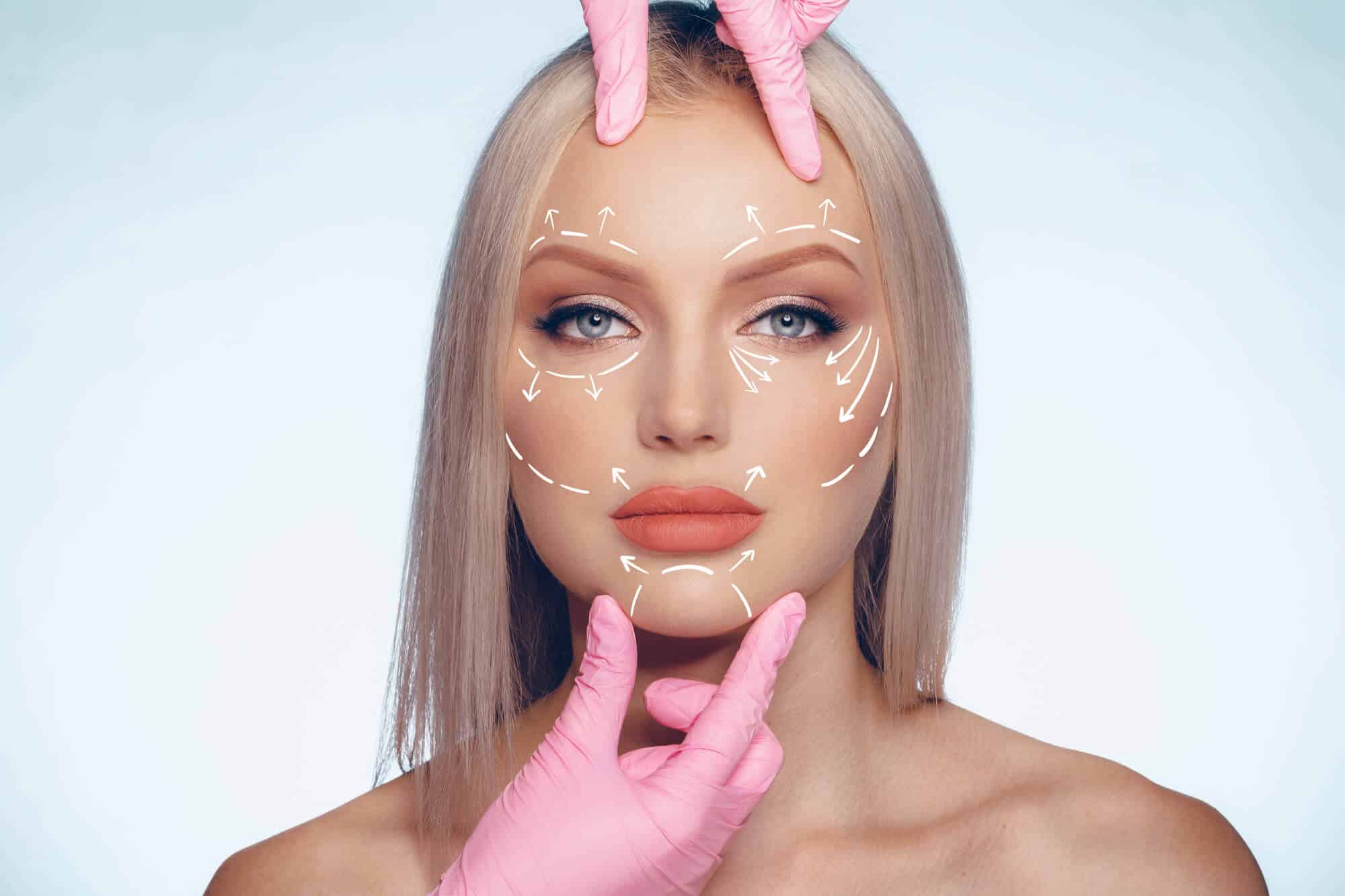 A woman with blonde hair faces the camera as hands in pink gloves touch her face; white surgical guideline arrows, often seen before a facelift or eyelid surgery, are drawn on her skin.